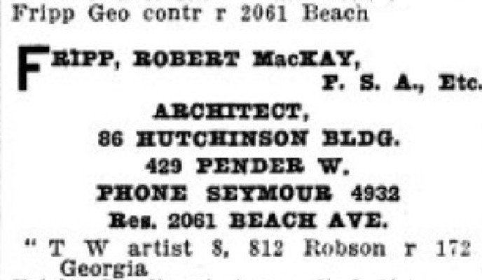 Fripp exhibited in the 1920 Annual Exhibition of the B.C. Society of Fine Arts, held at the Vancouver School Board offices on Hamilton Street.
