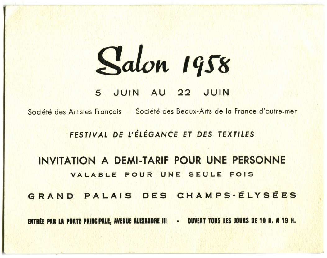 | This would have been an exciting envelope for an artist to receive ... the response to the artist's submission to the 1958 Paris Salon, hosted by the Societe des Artistes Francais. One artwork accepted! The letter is addressed to Mary Drukker, but the exhibitor's pass is signed by both Mary Drukker and Patricia Drukker. In any case, it is a nice collection of original information from 2/3rds of a century ago. |