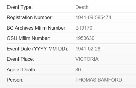 They had a son Thomas Harvey Bamford, who was born in Victoria on September 28, 1897. He died in Victoria on April 27 1980, married to Evelyn G. Bamford.