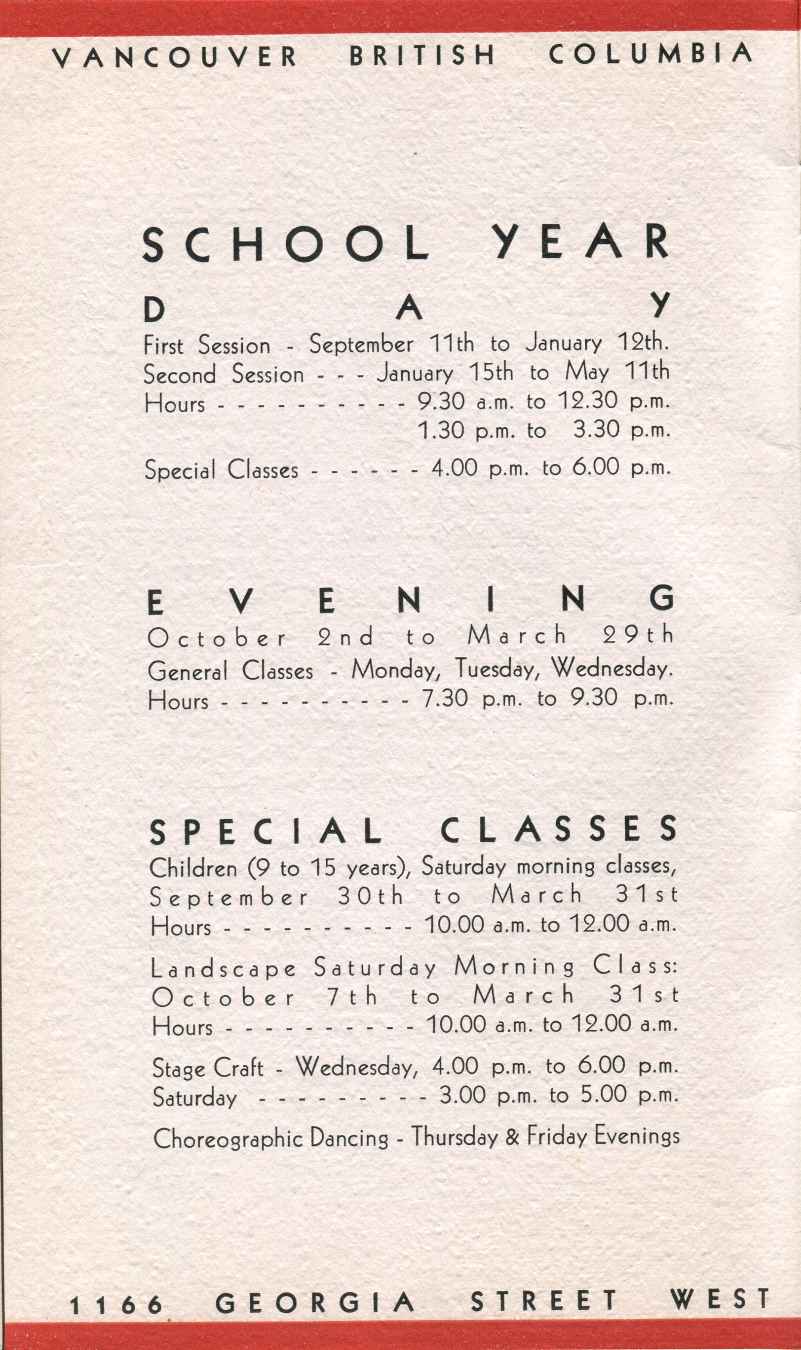 The school had a progressive schedule of public events, including day and evening art classes; Saturday morning classes for children; special classes in stagecraft and in Art and Metaphysics; and free public lectures every Saturday night. There was also a Student's Club, and two badminton courts were available for after-hours use in the auditorium.