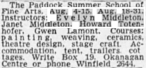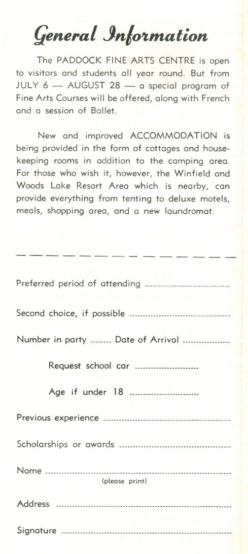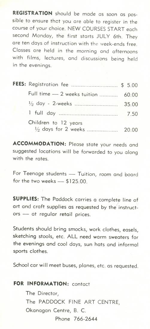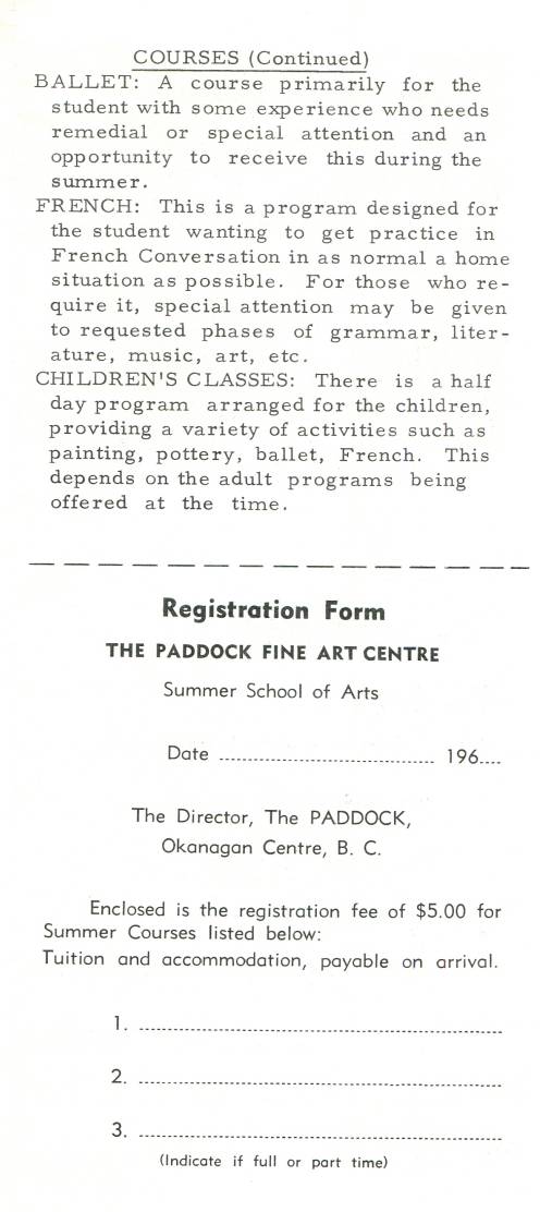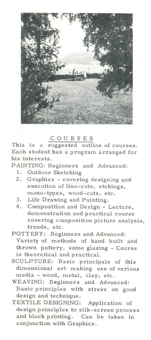 The summer school offered a wide variety of courses over the years, including ballet, character, commercial art, crafts, creative child art, creative writing, dancing, fashion design, French conversation, graphics, mime, music, painting, pottery (ceramics), sculpture, speech arts, stage craft, tailoring, textile design, theatre design, and weaving.