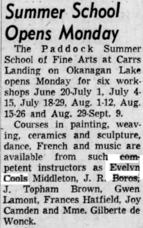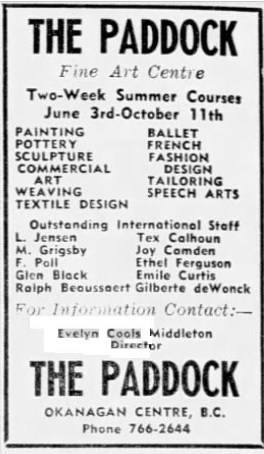 Beaussaert, Ralph Black, Glen Boros, J.R. Brown, Jessie Topham Calhoun, Tex (Rex Reginald Lloyd Calhoun, q.v.) Camden, Joy (ballet, character, mime) Curtis, Emile deWonck, Mme. Gilberte (French conversation) Ferguson, Ethel Grigsby, Marion Hatfield, Frances Jensen, Leroy (painting, graphics) Lamont, Gwendolyn Middleton, Evelyn Cools (painting, crafts) Middleton, Janet Poll, Frank (q.v.) Totenhofer, Howard E. (q.v.) |