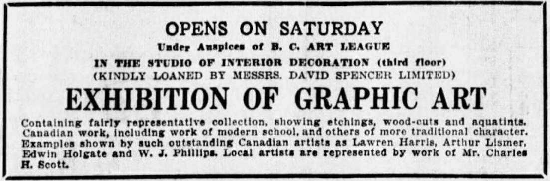 | 1927 Nov. 19 . ? | David Spencer Vancouver | B.C. Art League - Exhibition of Graphic Art |
