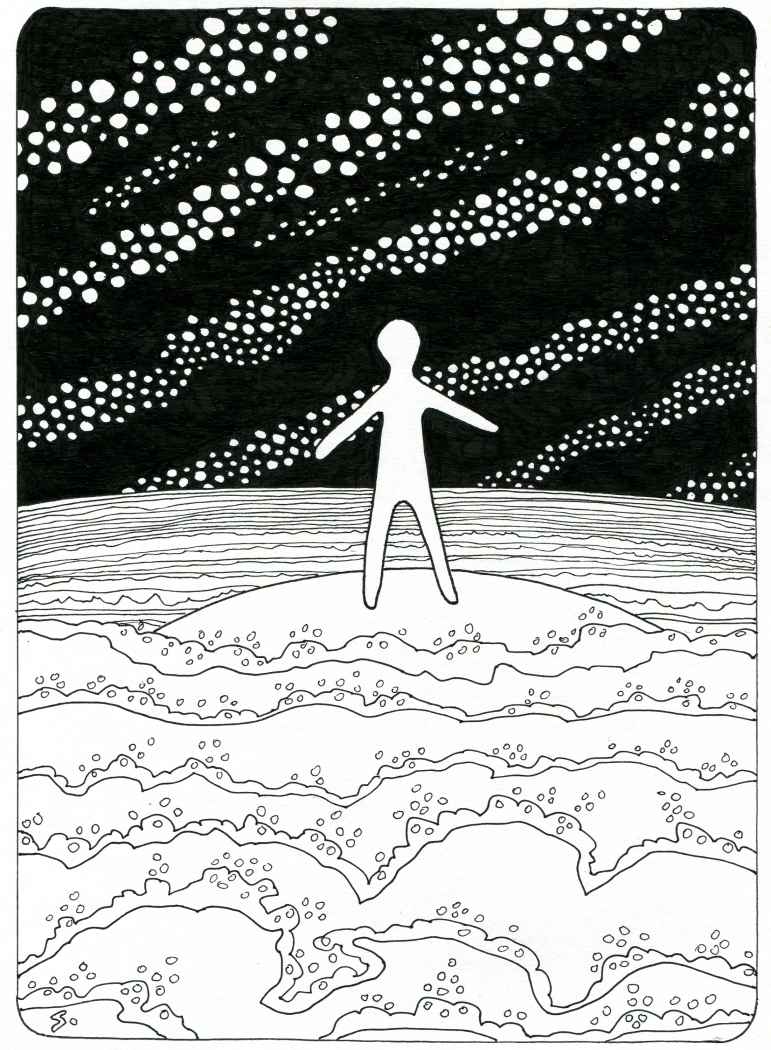 A prototypical human being finds themself in various scenes, which may be presented in any order if a story is desired to be woven from the images. The images are drawn with archival pigment ink and india ink brushpen on heavy-weight acid-free paper made in Canada by eco-jot. A sampling of 28 drawings in the series is shown below. There are over 50 drawings in the entire series, either completed or sketched as an idea. The drawings are shown generally in chronological order of their original creation date. Some drawings are completed in a day, other drawings take days or weeks, and so the creation and completion dates of numerous artworks overlap in time, and in concepts or motifs as they develop.